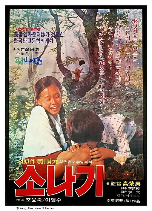 황순원의 단편소설 〈소나기〉를 영화화한 1979년 작품입니다. 원작에서는 이름이 없던 소년, 소녀에게 석이, 연이라는 이름이 생겼고, 황순원의 또 다른 단편 소설이 소녀의 할머니가 소녀에게 해주는 이야기와 소녀의 꿈의 형태로 삽입되었습니다.